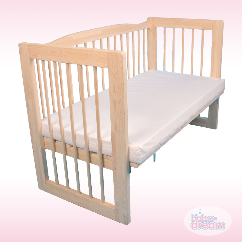 Ein Beistellbett in der Größe 120x60cm aus unbehandeltem Kiefernholz. Für den Fall dass ihr mit dem Begriff “Beistellbett” nichts anfangen könnt: es handelt sich um ein Babybett das mit zwei Winkeln am Elternbett befestigt wird. So schläft das Baby dicht bei seinen Eltern, kann ihre Atmung hören (was dem plötzlichen Kindstod vorbeugen und generell zu einem ruhigeren Schlaf des Baby führen soll) und auch das stillen fällt dadurch wesentlich leichter, weil man sich als Mutter nur zu Seite drehen muß und beide dabei problemlos einschlafen können, ohne dass das Kind wieder irgendwohin zurück getragen werden muss oder ähnliches.